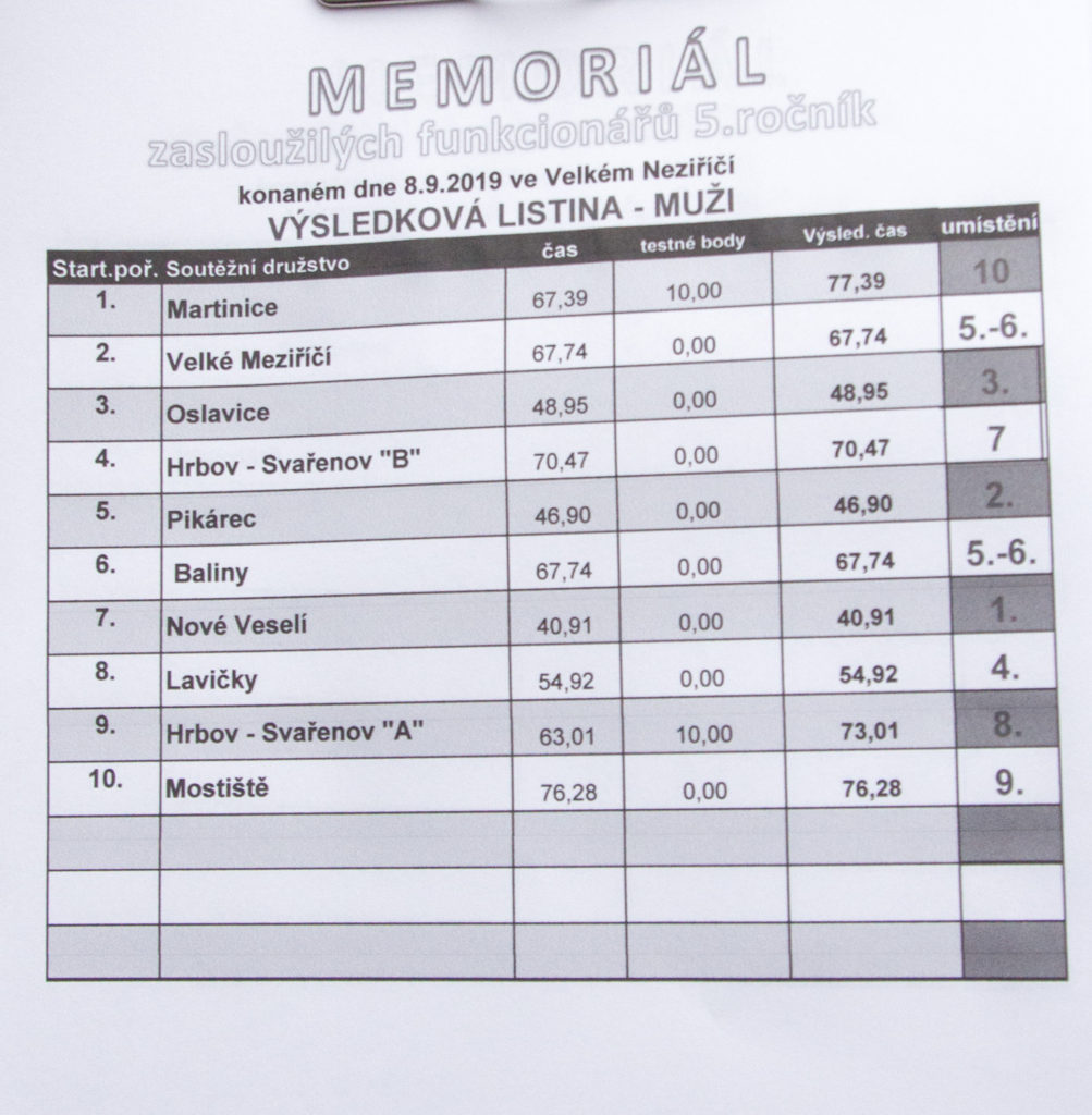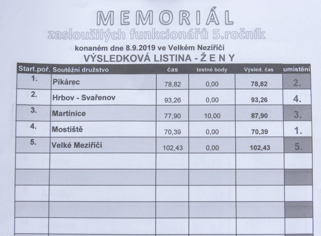 Hned tři týmy tentokrát nasadili Hrbovští a Svařenovští hasiči na soutěži ve Velkém Meziříčí (Memoriál zasloužilých členů, 8. 9. 2019) – jeden z nich ženský. Právě při útoku žen nastala drobná komplikace hned na začátku, kdy rozhodčí neuznali jako strojníka Josefa Pacala. Ženské družstvo si proto vypůjčilo strojnici z týmu Martinic. I přesto, že ženy útok provedly bezchybně, skončily s časem 93,26 s až na 4. příčce. První místo získaly Mostiště s časem 70,39 s, druhé Pikárec s časem 78,82 s a třetí Martinice s celkovým časem 87,82 s (i s 10 trestnými sekundami navrch). Umístění “na bedně” tak našim uniklo o nějakých 6 sekund.
