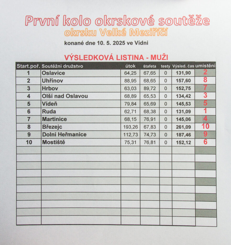 Na třetí příčce nakonec skončil tým z Olší nad Oslavou, druzí byli muži z Oslavice a na prvním místě skončili hasiči z Rudy. Domácí vídeňští se umístili na 5. příčce.