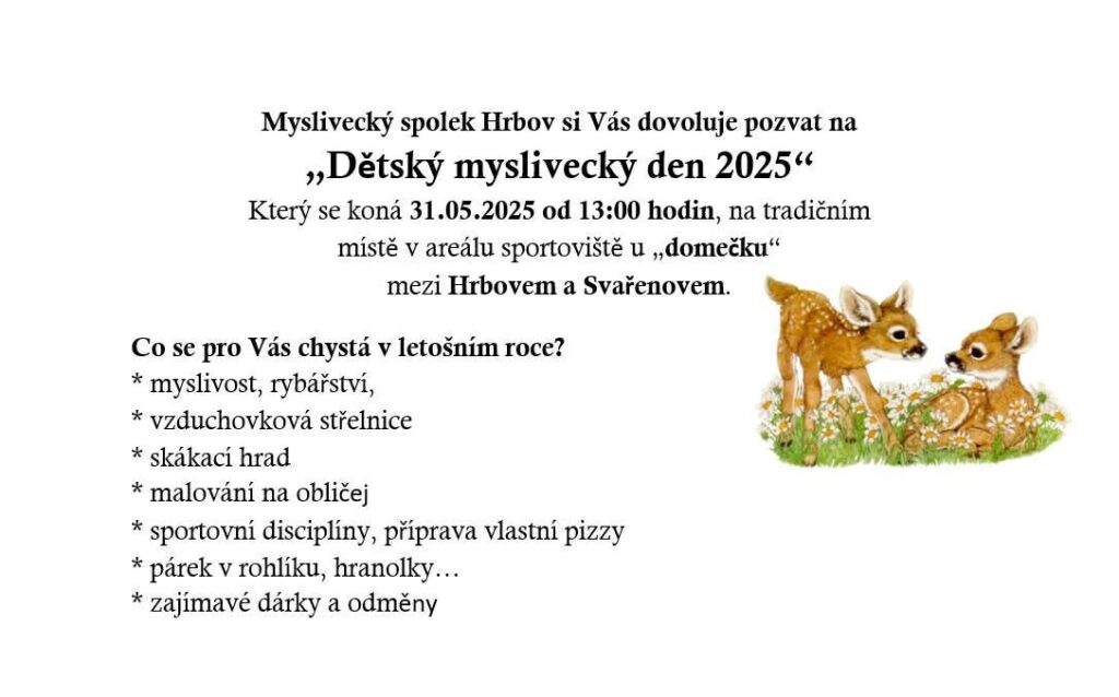 Myslivecký spolek Hrbov pořádá v sobotu 31. 5. od 13 hodin dětský den. A to na sportovním hřišti u kulturního domu. Tradičně nabídne ukázky práce myslivců, rybářů, možnost střelby ze vzduchovky, skákací hrad, malování na obličej a další. Samozřejmostí je občerstvení – nejen pro děti, ale pro celou rodinu.